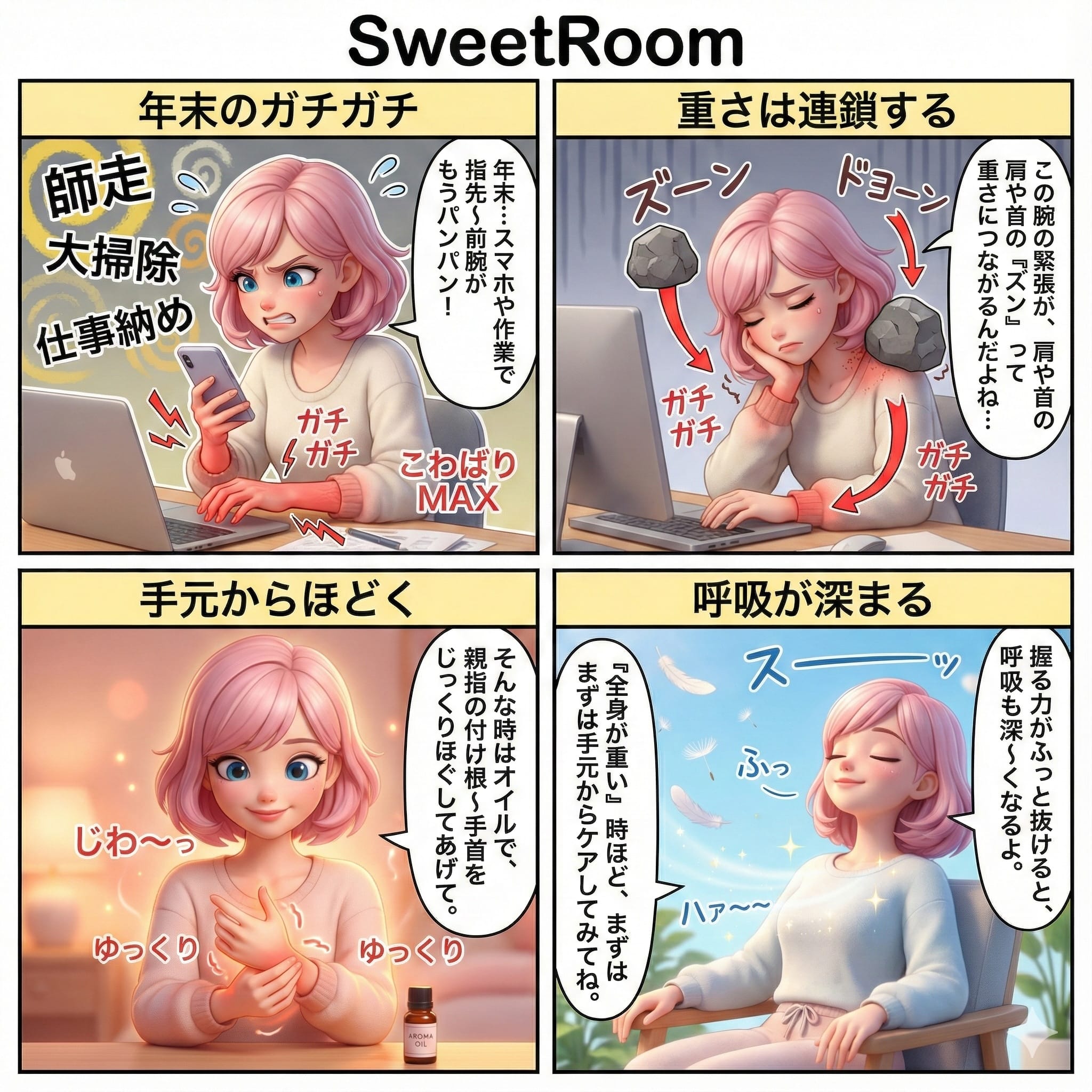 年末はスマホや作業が増えて、指先〜前腕がこわばりやすくなります。 手や腕の緊張は、肩や首の重さにもつながりやすいのが特徴です。 オイルケアで手のひら(特に親指の付け根〜手首)をゆっくりほぐすと、…